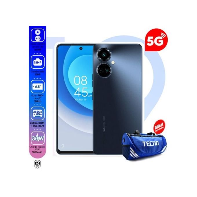Modèle : Camon 19 ProReseau: GSM / HSPA / LTE Dimensions 166.7 x 74.3 x 8.6 mm (6.56 x 2.93 x 0.34 in)Nombre de puces : Dual SIM (Nano-SIM, dual stand-by)Type d’ecran IPS LCD, 120HzTaille d’ecran 6.8 inches, 109.8 cm2 (~88.7% screen-to-body ratio)Resolution 1080 x 2460 pixels (~395 ppi density)Systeme d’exploitation: OS Android 12, HIOS 8.6Chipset MediaTek MT6833P Dimensity 810 (6 nm)CPU :Octa-core (2×2.4 GHz Cortex-A76 & 6×2.0 GHz Cortex-A55)GPU : Mali-G57 MC2Stockage Interne: 256GB 8GB RAMCAMERA principale: Triple 64 MP, f/1.6, 26mm (wide), 1/1.7″, 0.8µm, PDAF, OIS2 MP, f/2.4, (macro) 2 MP, f/2.4, (profondeur)Features Quad-LED flash, panorama, HDRVideo 1080p@30fps, HDR CAMERA SELFIE Single 16 MP, f/2.0, (wide)Features HDRVideo 1080p@30fpsSON Loudspeaker ouiPrise jack ouiWLAN ouiBluetooth ouiGPS Oui, avec A-GPSNFC: ouiRadio: FM radioUSB: USB Type-C 2.0,BATTERIE: Li-Po 5000 mAh, non-removableCharging Fast charging 33W, 100% in 65 min (advertised)